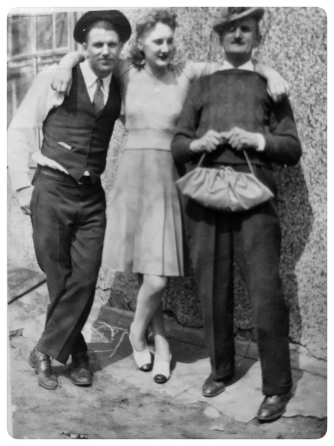 Goofy Grandpa Rettammel (Far right), with his daughter Eva Rettammel and son-in-law Herman Buehler, Sr., Late 1930s Lyndon Station WI.